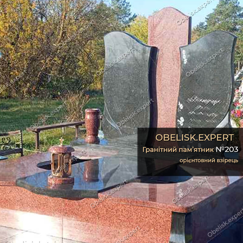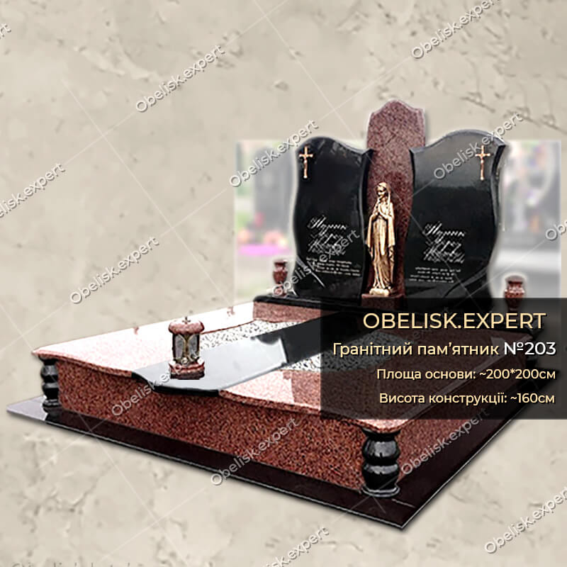Комбінований подвійний пам’ятник з червоного (Лізник) та чорного (місцевий Габро) каменів.