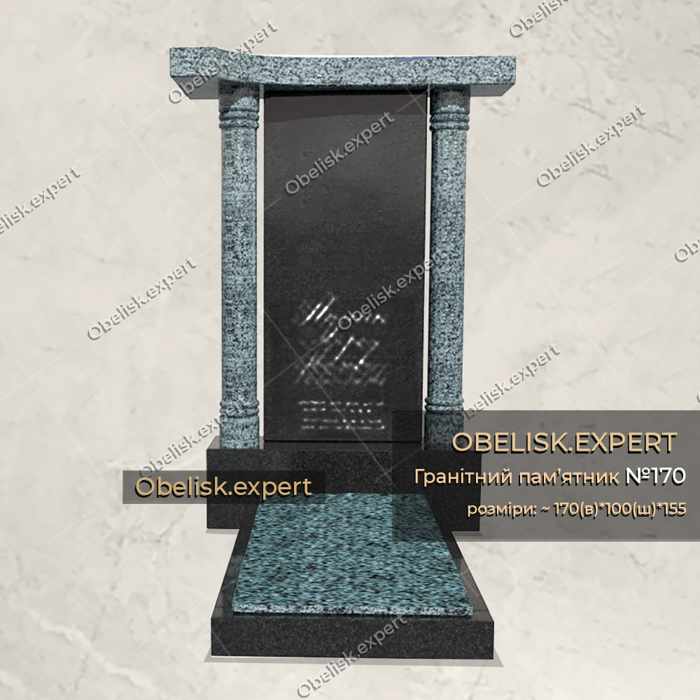 Комбінований пам’ятник з чорного (місцевий Габро) та сірого (Покостівка) каменю.